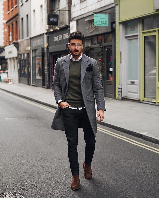 - چینو طوسی + پیراهن چهارخانه ملایم + ژاکت نازک + کفش کالج چرمی