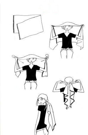 - شال یا روسری را پشت سرمان و بالا و روی پیشانی میگذاریم.