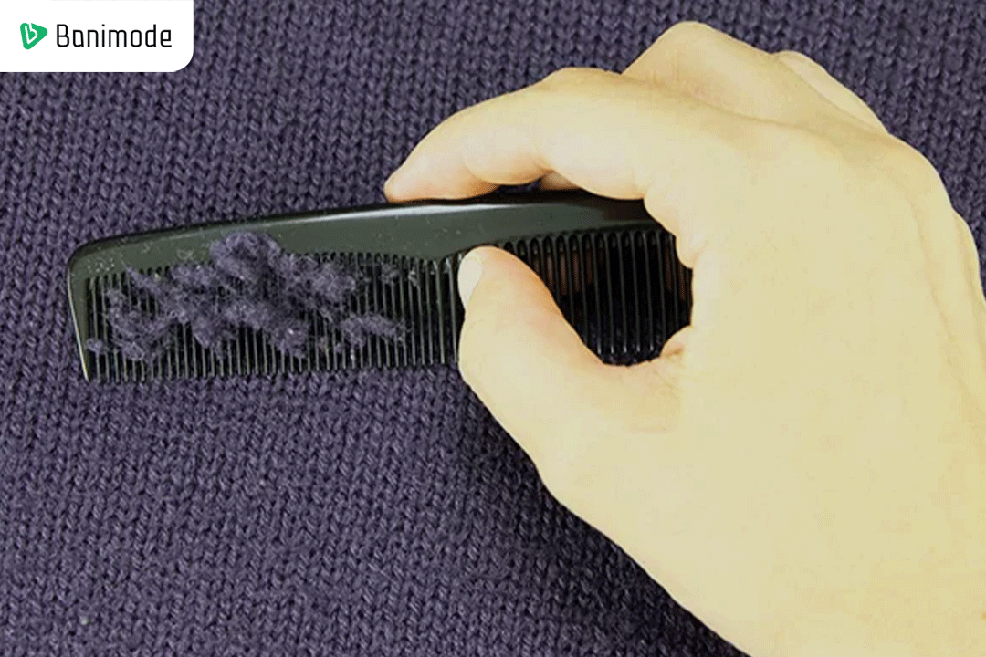 - شانه لباس: برای گرفتن پرز لباس، شانه لباس یکی از سادهترین و مؤثرترین ابزارها است که میتوان از آن برای پاک کردن پرزها استفاده کرد. این روش مخصوصا برای لباسهایی که پرزهای ریز و نرمی دارند بسیار مناسب است. برای استفاده از شانه، یک شانه دندانهریز را به آرامی از بالا به پایین روی لباس بکشید. این کار باعث میشود که پرزها در بین دندانهها جمع شوند و لباس شما به سرعت از پرزهای اضافی پاک شود. دقت کنید که این کار را به آرامی انجام دهید تا به بافت لباس آسیبی وارد نشود. شانههای مخصوص پرزگیری معمولاً برای لباسهای پشمی و بافتنی بسیار مفید هستند، زیرا به خوبی پرزهای ریز و مخفی را از بین میبرند. علاوه بر این، این روش هیچگونه آسیبی به پارچه نمیزند و برای لباسهایی با الیاف حساس مناسب است. استفاده از شانه به ویژه برای لباسهایی که به دلیل سایش زیاد دچار پرز میشوند مانند نواحی آستین و پشت، بسیار مفید است.